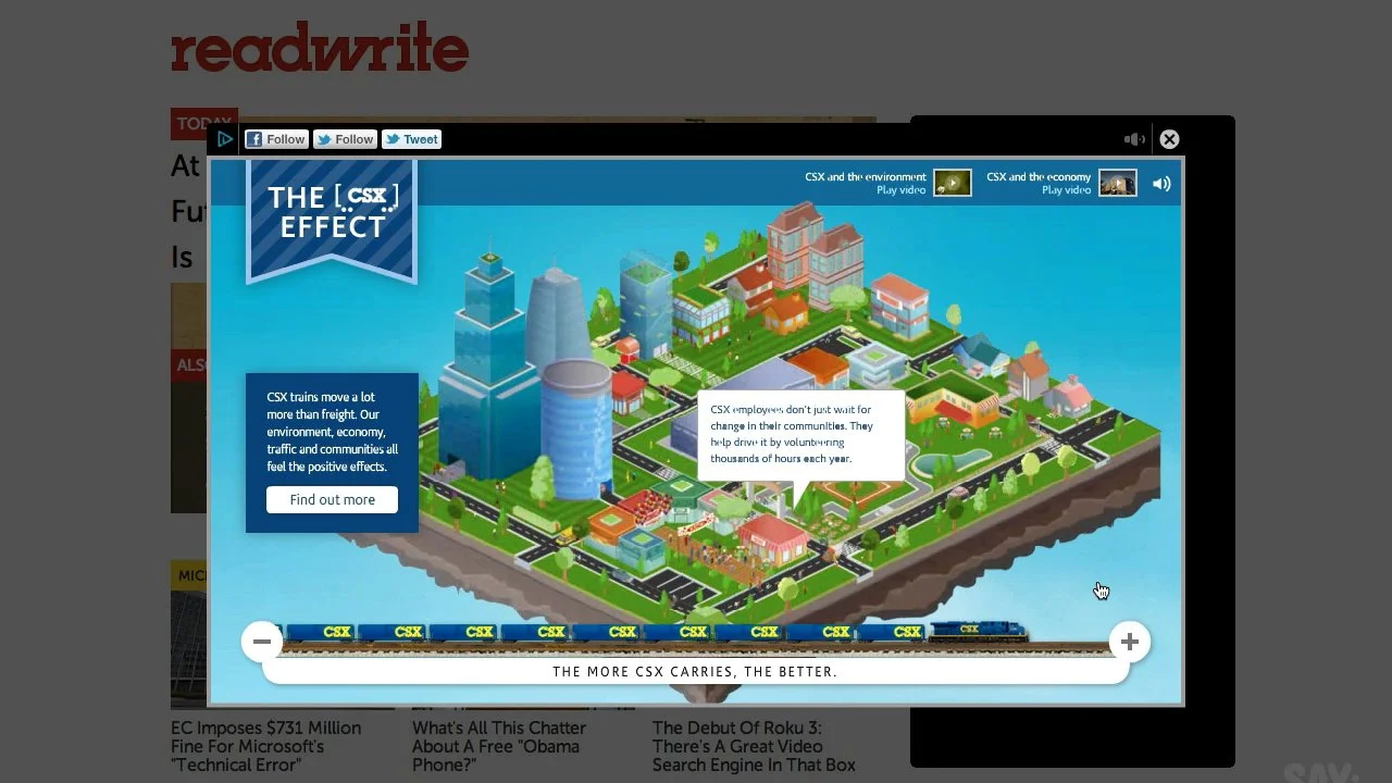 Scope: CSX wanted to incorporate a visually engaging yet simple UI to showcase the positive effects on the environment, economy and communities. The ad consists of an isometric perspective of a community. As the train advances at the bottom of the ad, the isometric community gets greener, quieter and much more efficient. The user can simply watch the ad, or use the train as a slider to see the community advancements. We also leveraged CSX's two highly visual broadcast spots. The ad performed really well in terms of time spent and brand awareness.